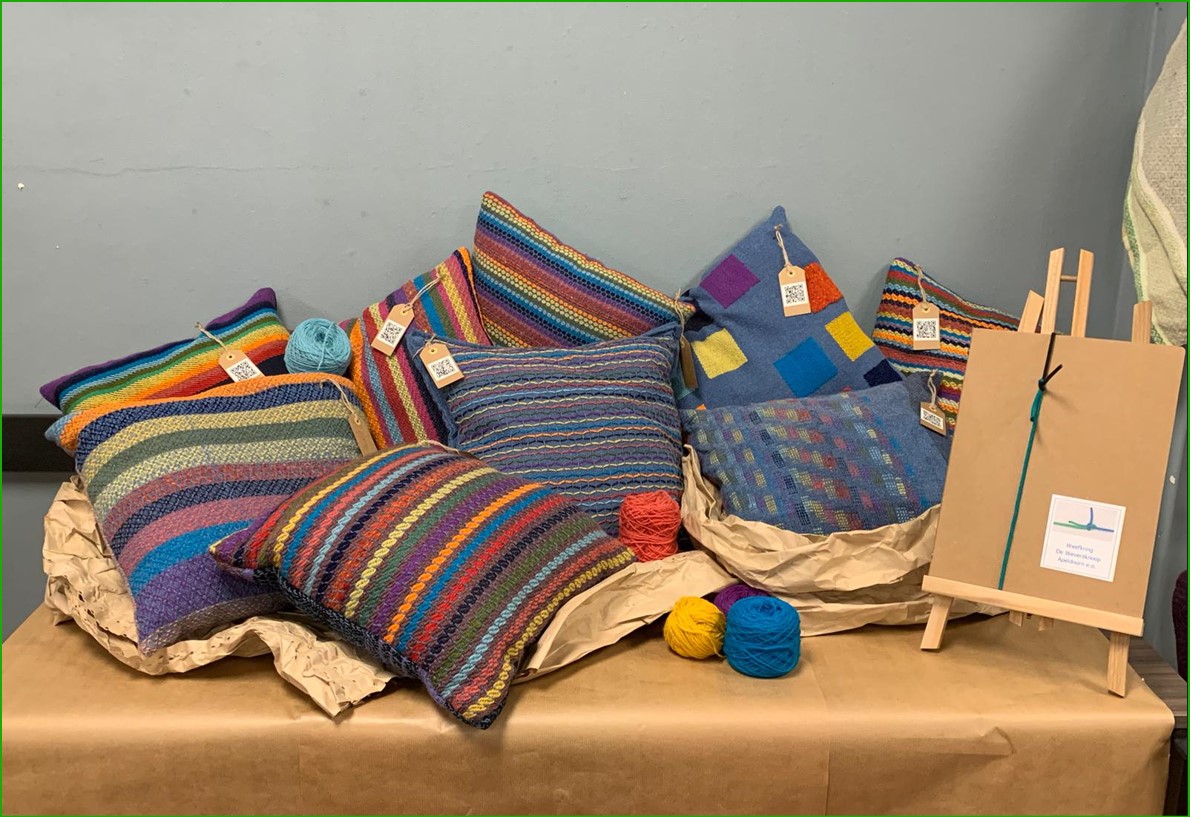 Waarbij de opdracht was om een kussen te maken 40 x 40 cm, ketting VENNE jeansgaren, WOL uit erfenis van overleden lid. Een ‘ding’ mocht men zelf bedenken.