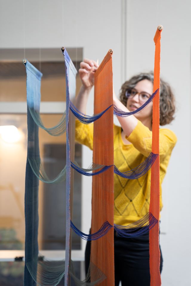 De weefsels zijn in zijn geheel op het weefgetouw geweven. Er ontstaat volume en beweging wanneer het weefsel van het weefgetouw wordt gehaald. Het textiel komt tot leven.